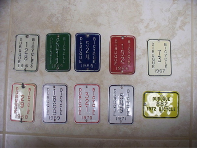 BICYCLE LICENSES. A collectible item, the metal licenses were replaced with gummed stickers in later years.