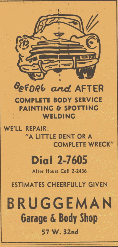 BRUGGEMAN GARAGE & BODY SHOP. The 1951 Dubuque City Directory listed 57 W. 32nd.