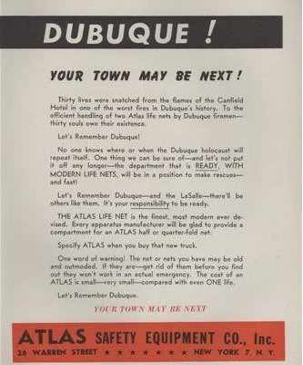 The Dubuque firemen are not bragging about the Canfield fire. It was not a perfect job on our part. None of them are,, and like the Monday morning quarterback, the next day we could have done better. Any time a community has a fire that takes the lives of 19 persons, and a property loss of $200,000 there isn't much to feel proud of, but comparing the Canfield to the LaSalle or the Wynecoff, ours was a small job.