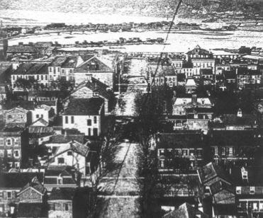 The plat naturally followed the river terrace which broadened and turned to the southwest below West 1st Street. Bluff and the other principal streets turned at that point and in that direction. Building lots unfailingly oriented east/west onto these principal streets. The lots west of Bluff were elongated. It is noteworthy that no provision was made for north/south oriented lots around Washington Park or on the cross streets. Consequently the vast majority of district buildings orient east/west and buildings fronting on cross streets tend to be of shallow draft so as to fit their partial lots. Only West Third and West 5th streets proceeded west of Bluff. Alleys were improved to function as additional means of access. The district nomination notes the important fact that numerous early Bluff Street residences, fronting east, were positioned in the centers of these long narrow lots and were “buried” visually when later infill was constructed across their frontages. Again, the historical images document many of these hidden buildings, all of which date to the 1850s.