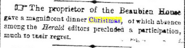 The major feature of the celebration was the Christmas Eve Ball at one of the local hotels. A huge dinner would be offered preceding music and dancing. The last of these gatherings of the old settlers was held in 1866. (2)