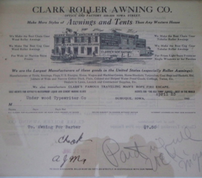 CLARK ROLLER AWNING COMPANY. Established in 1900, the Clark Roller Awning Company offered more styles of awnings and tents than any other awning manufacturer in the United States. Part of the success was due to the company owning he patents on their own awnings. The company manufactured tents, canopies, canvass hammocks, sacks, and national and foreign flags. The company also sold twine, rope, camp and lawn furniture, campers' and hunters' outfits and cooking utensils.