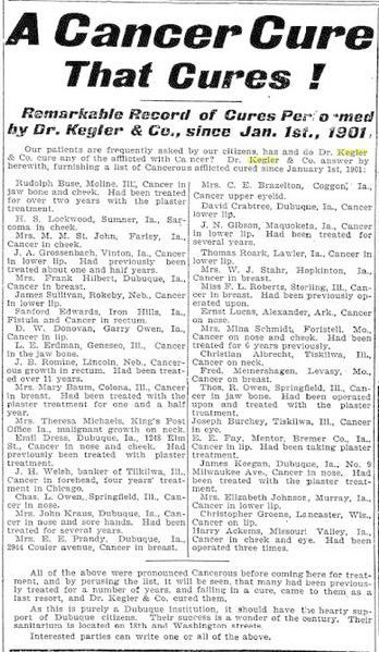 DR. KEGLER AND COMPANY. This sanitarium was established on 8th and Washington STREETS, by Christian Mathias KEGLER and an associate. Using Kegler's name, several people incorporated the KEGLER CANCER CLINIC in 1905 after Kegler's death in 1902.