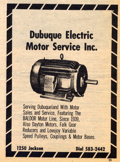 DUBUQUE ELECTRIC MOTOR SERVICE INC. The 1951 through 1977 Dubuque City Directory listed 1250 Jackson.