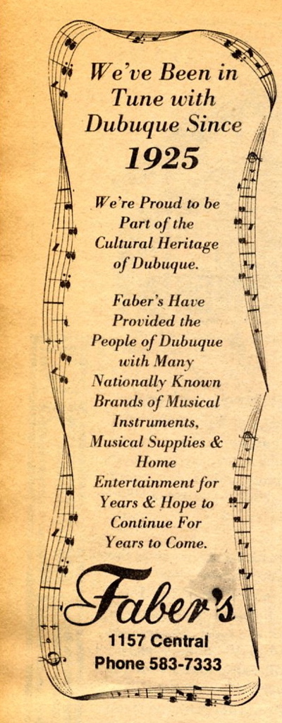 FABER'S. Established in 1925, the Faber Music Company as it was known as late as 1979 had as its slogan "Dubuque's Most Complete Music Store."