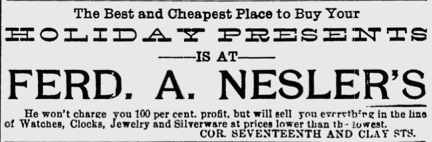 The 1909 Dubuque City Directory through the 1918 Dubuque City Directory listed 1732 Clay as the address. F. A. Nesler & Son Jewelry Store was the name used after 1915.