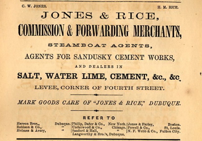 JONES & RICE. The 1857-1858 Dubuque City Directory listed the corner of 4th and Iowa.