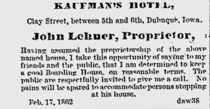 The 1865 Dubuque City Directory listed "Kaufman House" at Clay between 5th and 6th.