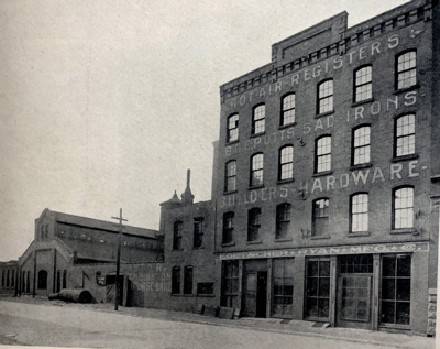 LOETSCHER-RYAN MANUFACTURING COMPANY. Established and incorporated in 1880, the company employed one hundred people in the production of various types of hardware. These included flower pot brackets, store door handles, foot scrapers, side lamp brackets, registers, wall frames, chest handles in patterns for special uses, and trunk or box castors.