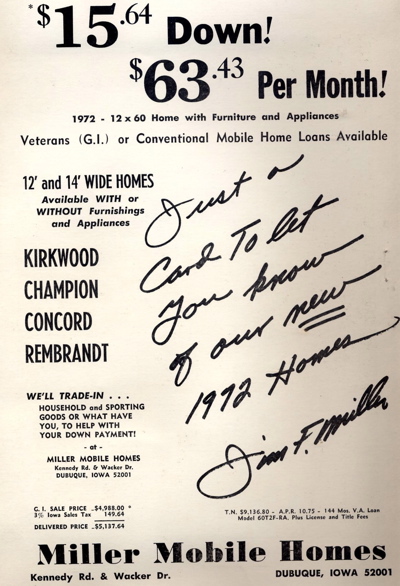 MILLER MOBILE HOMES. The 1972 and 1974 Dubuque City Directory listed 540 J. F. Kennedy Road and 1998 White.