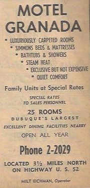 MOTEL GRANADA. The 1955 Dubuque City Directory listed 3.5 miles north on Highway 52. It was operated by Milt Eichman.