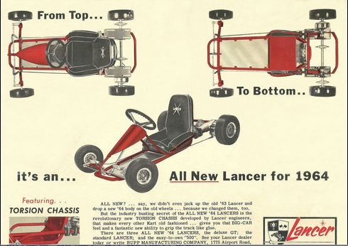 The cubic inch displacement varied from 5.8 on Class A karts to 16.5 on some Class C models. Built low to the ground, the karts had a clutch and brake on either side on the front of the machine. Power was provided by one or two engines. Class A karts for drivers 9-11 were limited to 12 miles per hour while Class B had a minimum age of 12 and traveled at 20 miles per hour. Adult karts could reach 70 miles per hour.
