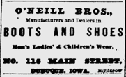 O'NEILL BROTHERS. The 1865 Dubuque City Directory listed Main between 5th and 6th.