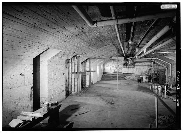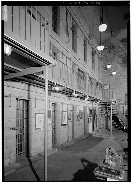 The jail was constructed in two parts. A two-story square section was used as living quarters for the sheriff's family. The jail was attached to the south side. Three tiers of cells were located along the eastern wall with a catwalk used to reach the upper cells. The stonewalls were eighteen inches thick. A cell block in the curved-ceiling dungeon was used to hold Confederate prisoners during the CIVIL WAR and later found use with incorrigible prisoners who caused trouble in the upper cells. Six cells were added in 1874 to house juvenile and women prisoners. This area was later used for those in solitary confinement.
