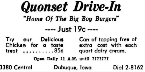 QUONSET DRIVE-IN. The 1951 and 1955 Dubuque City Directory listed 3380 Central. The manager was Ray Dolter. Dolter had returned to his hometown after operating a grocery store in Milwaukee in the mid-1940s. He chose the location because of the traffic from the battery factory, railroad yard, MELODY MILL and the JOHN DEERE DUBUQUE WORKS.