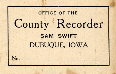 SWIFT, Samuel. (Benton, WI, Oct. 15, 1875--Dubuque, IA, July 19, 1952). A barber by trade, Swift served as county recorder from January 1, 1907 through December 31, 1912. In 1916, Swift was president of the Dubuque Poultry Association. He served in the state legislature in 1933-1934.