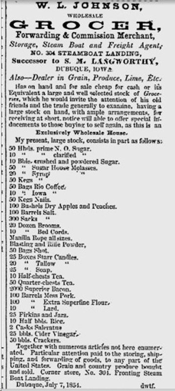 W. L. JOHNSON. The 1858-1859 Dubuque City Directory listed 9 Levee.