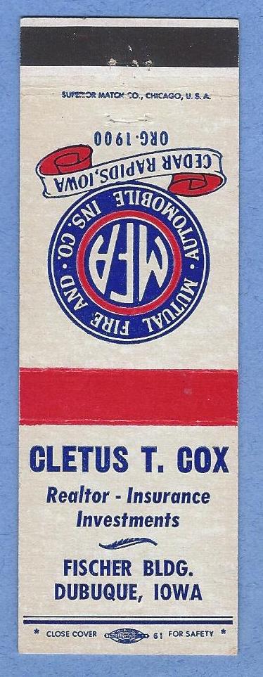 CLETUS T. COX. The 1951 through 1957 Dubuque City Directory listed 405 BANK AND INSURANCE BUILDING.