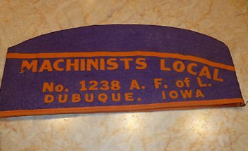 KEY CITY LODGE MACHINISTS LOCAL UNION NO. 1238. The 1937 ''Dubuque Consurvey Directory'' listed the | [[File:machinists12238.png|250px|thumb|left|Cap]] | ||