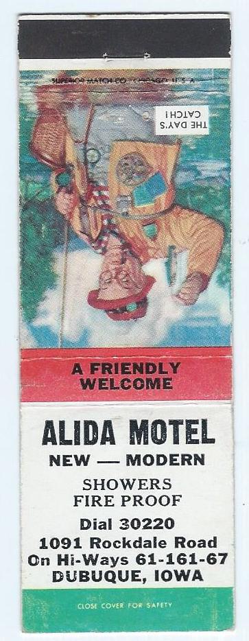 ALIDA MOTEL. The 1955 through 1964 ''Dubuque City Directory'' listed 1091 Rockdale. | [[Image:av9.jpg|left|thumb|250px|Matchbook. Photo courtesy: Mike Avittt]]ALIDA MOTEL. The 1955 through 1964 '''Dubuque City Directory''' listed 1091 Rockdale. | ||