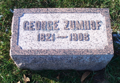ZUMHOF, George. (Hanover, Germany, Jan. 9, 1821-Dubuque, IA, Apr. 6, | [[Image:zumhof.jpg|left|thumb|250px|Headstone in Linwood Cemetery]]ZUMHOF, George. (Hanover, Germany, Jan. 9, 1821-Dubuque, IA, Apr. 6, 1908). Proprietor, Mississippi House. Zumhof came to Dubuque on April 24, 1847, and began a series of careers that started with a bakery at the corner of Fifth and Main. He continued this until 1853 when he built the Mississippi House on White Street between Fifth and Sixth [[STREETS]]. He entered into a variety of business ventures between 1862 and 1881 including [[ICE]] packing. | ||