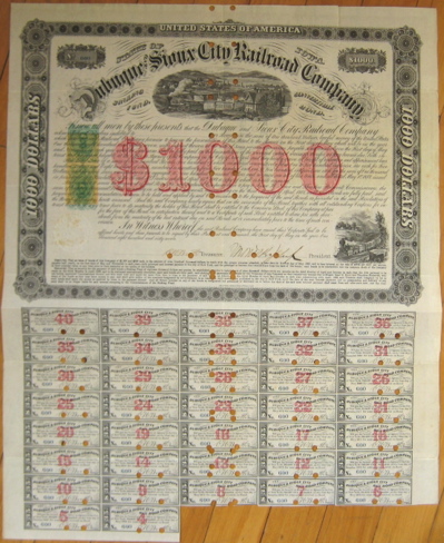 [[Image:Dubuque and Sioux City Bond.jpg|right|thumb|250px|Stock certificate]] | |||