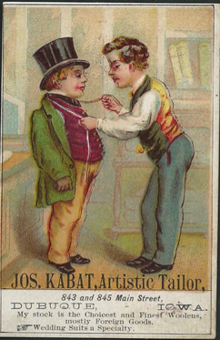 [[File:kabat.jpg|200px|thumb|left|Clothing fastener. Photo courtesy: Bob Reding]]JOSEPH KABAT. The 1865 ''Dubuque City Directory'' listed 139 Main. | [[File:kabat.jpg|200px|thumb|left|Clothing fastener. Photo courtesy: Bob Reding]]JOSEPH KABAT. The 1865 '''Dubuque City Directory''' listed 139 Main. | ||