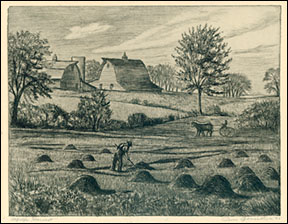 Winning several awards at the Iowa Art Salon (1931-1940) led to Criss receiving the WPA mural commission for the Leon, Iowa post office. Her painting was named “Rural, Free Delivery.” Her painting, “Wheat Shocks,” was selected to represent Iowa at Rockefeller Center (NYC) in 1937. It had won awards from the Central States Fair [Aurora, IL], Iowa Federation of Women’s Clubs, and the Dubuque Artists Show (1931). A third painting, “All American Tea Party,” shown at the 1936 Iowa Art Salon, received national attention at the ACA Gallery in New York City in 1937. The Glasells maintained an art studio on Dubuque’s Main Street for many years, making ceramics and hosting art association gatherings. During the GREAT DEPRESSION, the couple became regionally known for painting portraits at area fairs and bazaars. (4)
