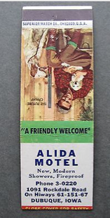 ALIDA MOTEL. The 1955 through 1964 ''Dubuque City Directory'' listed 1091 Rockdale. | [[File:ALIDA.png|250px|thumb|left|Matchbook]]ALIDA MOTEL. The 1955 through 1964 ''Dubuque City Directory'' listed 1091 Rockdale. | ||