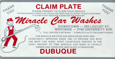 [[Image:miraclecar.png|right|thumb|250px|Photo courtesy: Bob Reding]]MIRACLE CAR WASH. Established by Dr. [[JOHNSTON, Wayne A.|Wayne A. JOHNSTON]] in 1960, the business in | [[Image:miraclecar.png|right|thumb|250px|Photo courtesy: Bob Reding]]MIRACLE CAR WASH. Established by Dr. [[JOHNSTON, Wayne A.|Wayne A. JOHNSTON]] in 1960, the business in 2014 was still located at 255 Locust. The company slogan was "Protect Your Investment Inside, Outside & Underneath." | ||