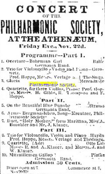 PHILHARMONIC SOCIETY. Organized in May, 1854, the Society's object was "to cultivate a knowledge of music." | [[File:phil.png|250px|thumb|left|1872 performance announcement. Photo courtesy: Telegraph Herald]]PHILHARMONIC SOCIETY. Organized in May, 1854, the Society's object was "to cultivate a knowledge of music." (1) The group performed large concerts and occasionally was hired to serenade at an individual's birthday. Similar groups in the late 1800s from outside of Dubuque included vocalists and comedians. (2) | ||