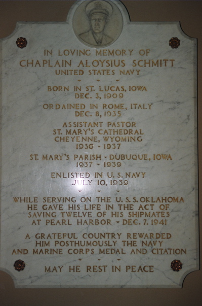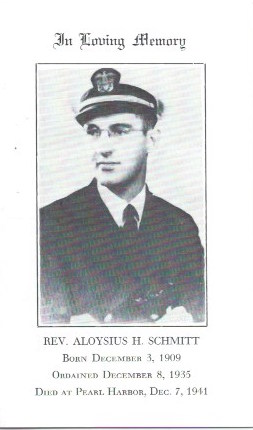 SCHMITT, Aloysius (Father). (St. Lucas, IA, Dec. 3, 1909--Pearl Harbor, HA, Dec. 7, 1941). Chaplain of the USS Oklahoma. The first chaplain to die in WORLD WAR II, Father Schmitt perished while heroically attempting to save others following the Japanese sneak attack on Pearl Harbor. He was the first Iowan and first clergyman to die in WORLD WAR II. (1)