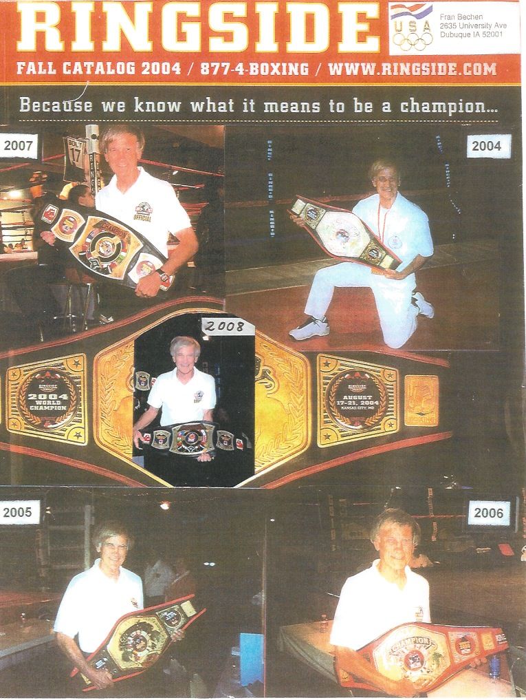 Bechen held a record for being the only boxer ever to quality six times for the Chicago Golden Gloves Tournament of Champions. When the World Masters program began around 2002, Bechen entered. Competitions in this program featured boxers 35 years or older competing in categories determined by age and weight. (See picture of Bechen's championship belts.)