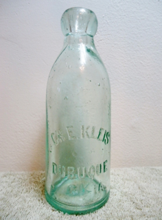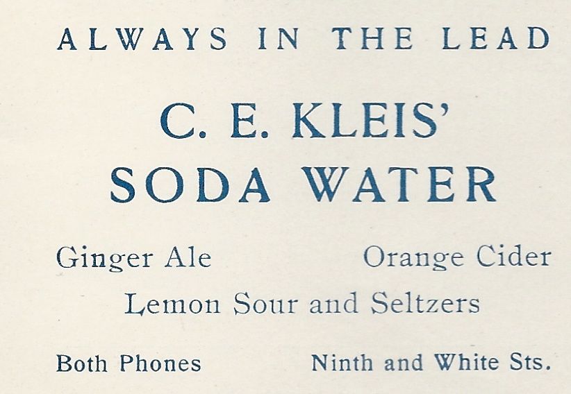 Organized in 1865, the company, a continuation of the firm established by Christian E. Kleis was located at 455 Ninth Street. Seven workmen were employed in manufacturing soda water in seven different flavors, ginger ale, seltzers, and all kinds of carbonated drinks. The company's capacity of soda water production in 1910 was 300 cases daily. (1) The bottling works also manufactured a large amount of pop and the more popular flavors of "jersey cream" and cherry. (2)