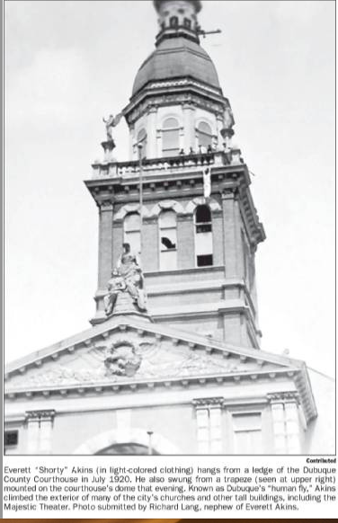 To witness one of his most publicized feats, in July 1920, crowds gathered outside the DUBUQUE COUNTY COURTHOUSE as Akins began his ascent. Reaching the base of the dome, where most spectators expected him to stop, Akins found enough room between the copper plates for his fingers to grasp that he continued on to the top of the building. Akins thrilled the crowd by swinging from a trapeze and dropping backward, catching himself with his feet, while hanging head down. A second performance in the evening drew an even larger crowd. In September 1920, Akins scaled the BANK AND INSURANCE BUILDING but had to have assistance getting over the upper cornice. (See note written prior to this climb.) (1)