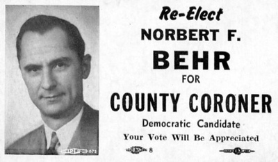 BEHR, Norbert. (Sherrill's Mound, IA, Jan. 8, 1913--Dubuque, IA, Dec. 30, 2000). Funeral director. Behr was a licensed funeral director and embalmer in Dubuque since 1934 and was elected Dubuque County Coroner for three terms. He was the founder of BEHR'S FUNERAL HOME established in 1936 in Dubuque and the Miller Funeral Home established in 1975 in East Dubuque, Illinois.