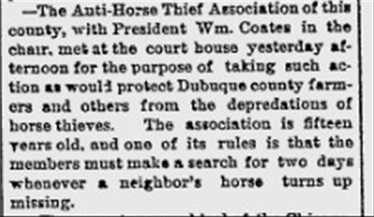 [[Image:THIEF.jpg|left|thumb|250px|Dubuque Daily Herald Oct 31,1886]]ANTI-HORSE THIEF ASSOCIATION. | [[Image:THIEF.jpg|left|thumb|250px|Dubuque Daily Herald Oct 31,1886]]ANTI-HORSE THIEF ASSOCIATION. | ||