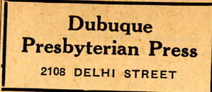 DUBUQUE PRESBYTERIAN PRESS. The Dubuque Presbyterian Press published the [[PRESBYTERIAN MESSENGER]]. | [[Image:DPP.jpg|left|thumb|250px|1938 advertisement. Photo courtesy: Bob Reding]]DUBUQUE PRESBYTERIAN PRESS. The Dubuque Presbyterian Press published the [[PRESBYTERIAN MESSENGER]]. | ||