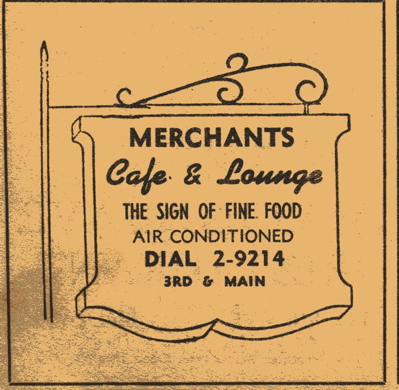 [[Image:merchants1.jpg|left|thumb|250px|1951 advertisement. Photo courtesy: Bob Reding]]MERCHANTS CAFE & LOUNGE. The 1951 ''Dubuque City Directory'' listed 326 Main. | [[Image:merchants1.jpg|left|thumb|250px|1951 advertisement. Photo courtesy: Bob Reding]]MERCHANTS CAFE & LOUNGE. The 1951 and 1955 ''Dubuque City Directory'' listed 326 Main. | ||