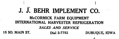 The 1966 through 1970 ''Dubuque City Directory'' listed the same address for J. J. Behr Farm & City Distributing Company. | The 1966 through 1970 ''Dubuque City Directory'' listed the same address for J. J. Behr Farm & City Distributing Company. | ||