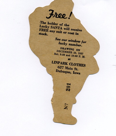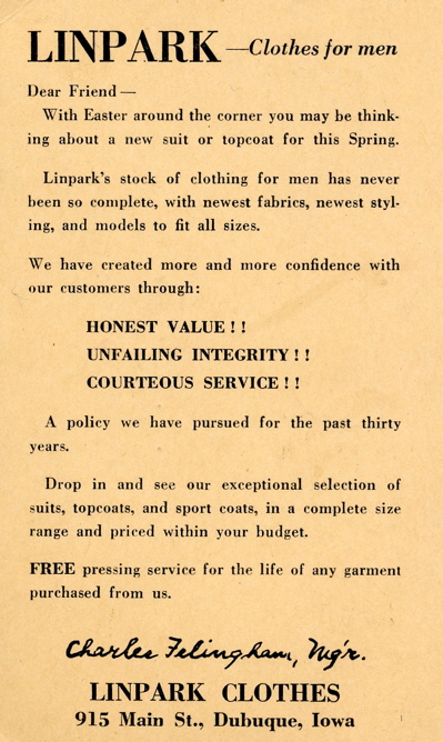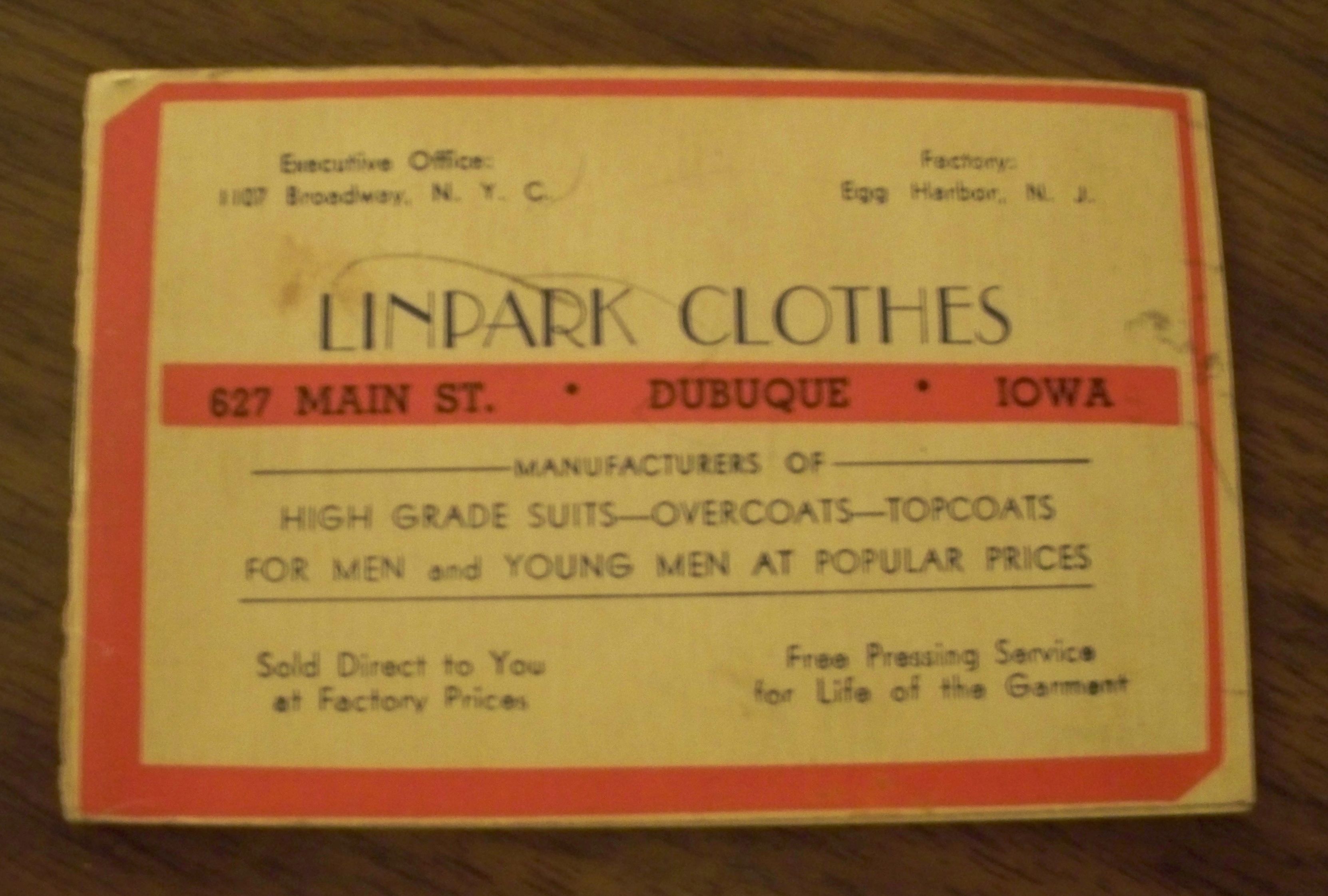 [[Image:imp376.jpg|left|thumb|250px|Photo courtesy: Bob Reding]]LINPARK CLOTHES. The 1937 ''Dubuque Consurvey Directory'' | [[Image:imp376.jpg|left|thumb|250px|Photo courtesy: Bob Reding]]LINPARK CLOTHES. The 1937 ''Dubuque Consurvey Directory'' through 1945 ''Dubuque City Directory'' listed 627 Main. | ||