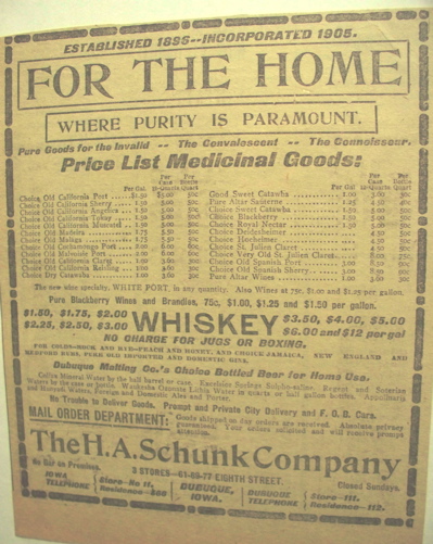 In 1912 the H.A. Schunk Company was again listed as a business in Dubuque. The company was then located at 46 8th. They were proprietors of the Home Supply Company, a wholesale and retail liquor outlet. H.A. Schunk was listed from 1914 to 1915 as operating only a tavern. He was last listed in 1916 operating a grocery store.