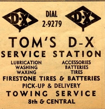 Revision as of 00:46, 30 November 2011 by Randylyon (talk | contribs) (New page: left|thumb|250px|1951 advertisement. Photo courtesy: Bob RedingTOM'S D-X SERVICE STATION. The 1951 ''Dubuque City Directory'' listed 8th and Central. [[Category: Servi...)
