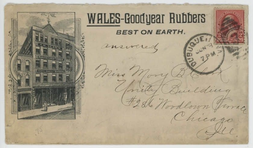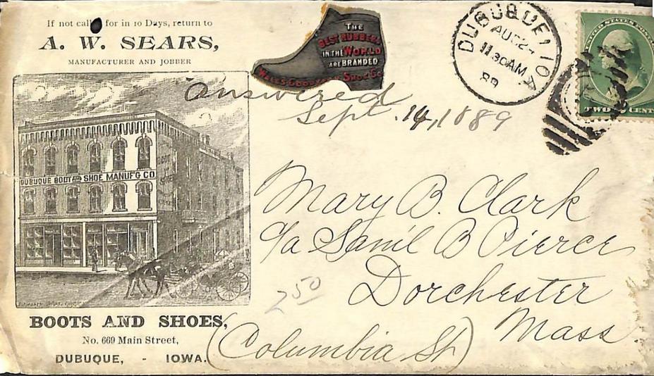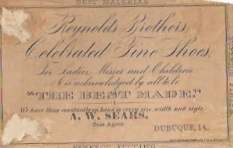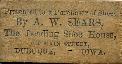 A. W. SEARS. Established in Dubuque in 1868, the company in 1895 handled products of the leading factories in the nation and the entire product of the DUBUQUE BOOT AND SHOE MANUFACTURING COMPANY. The trade area of the firm was largely in Iowa, Illinois, Wisconsin, Minnesota and South Dakota where three traveling salesmen carried on the business. A. W. Sears was the only agent in Dubuque for Wales-Goodyear rubber boots, a brand with forty-nine years in business.