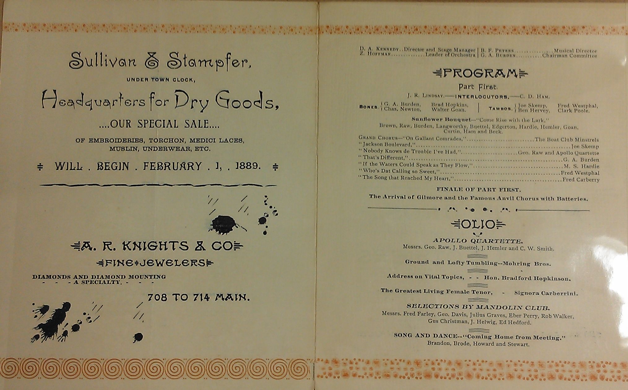 One of the club's popular events was the annual D. B. A. minstrel show. The first of the programs was held on January 29-30, 1889. The performance was a novelty for Dubuque and both presentations, open to the public, were given to packed houses at the GRAND OPERA HOUSE. The last minstrel show with young men and women in blackface was presented in March 1889. (2) The event was later carried out using traveling acts was continued for fifteen years.