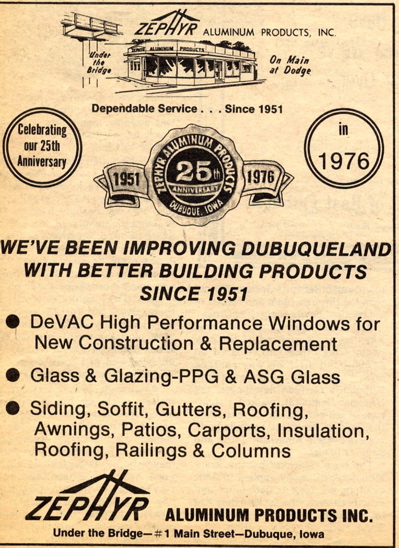 ZEPHYR ALUMINUM PRODUCTS INC. Established in 1951, Zephyr Aluminum was a family owned business. Their specialty was residential and commercial windows and doors. They also advertised their expertise in glass, mirrors, patio rooms, railings and awnings.