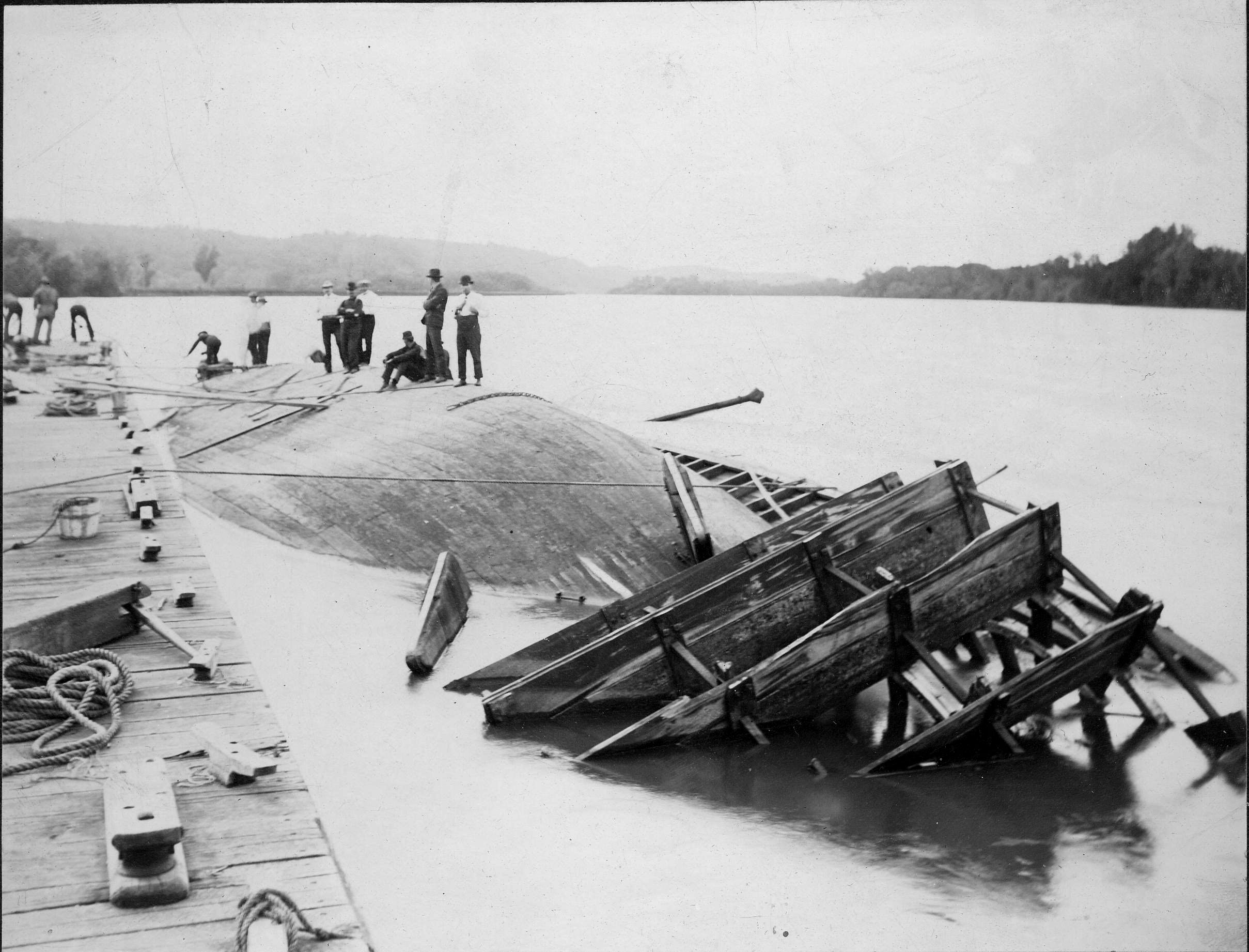 Dubuque pioneered the evolution of boats from wooden hulls to iron. In 1870 the first keel was laid for an iron vessel in Dubuque. The manufacturer, IOWA IRON WORKS, was founded in 1851 by Hammond ROUSE and Alfred TREDWAY. This steamboat was named the "Clyde," for the home in Scotland of William HOPKINS, a builder of ironclads during the CIVIL WAR and master mechanic. The 96-foot-long Clyde, the first iron-hulled boat built for the Upper MISSISSIPPI RIVER, was the second boat built for the logging trade.