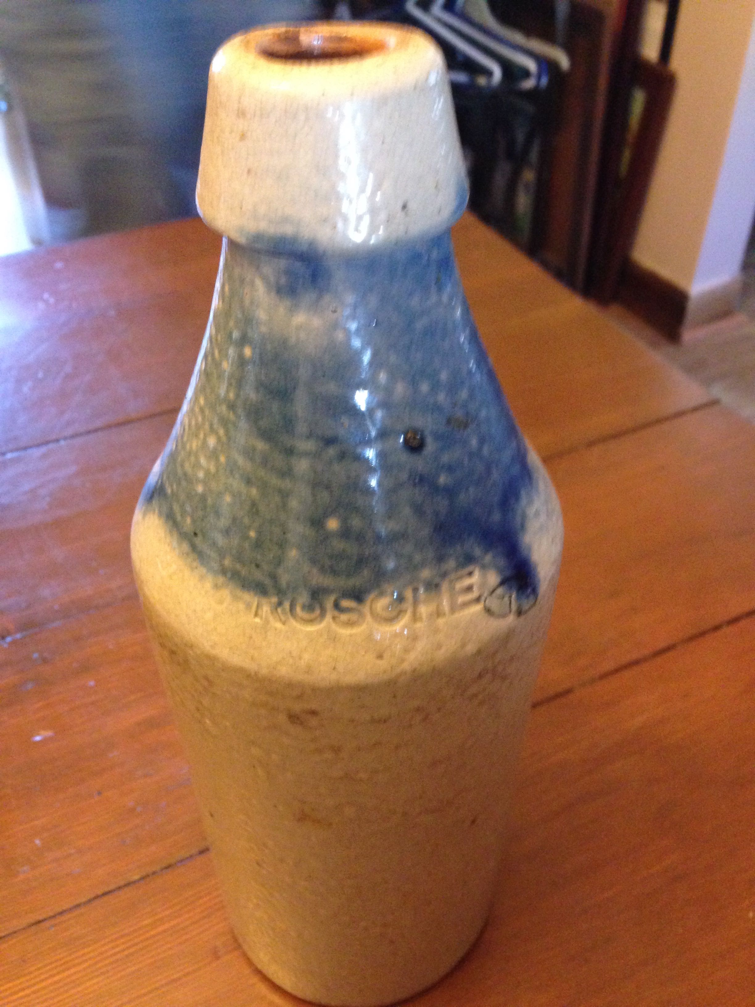 Advertisement and earthenware bottle. Photo courtesy: Jim Massey