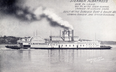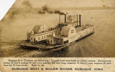 The "J. K. Graves," launched in 1885 by the Iowa Iron Works, was a giant raft-boat used to push rafts of logs to the mills. Steel-hulled packets for carrying freight and passengers included the "Cherokee," the company's first boat of this type. The "Cherokee" boasted electric lights and the capability of carrying up to one thousand passengers. Constructing the "Ferdinand Herold" required 125 workers and cost $80,000. Railroad ferries with track laid on the deck were constructed to transport trains across the Mississippi where bridges were temporarily out of service. At an average construction cost of $250,000 each, the "L. S. Thorne" (1898), "Pelican" (1902), "Albatross" (1907) and "B. F. Yoakum" (1910) and the “Willow” (1924) were important contributors to the Dubuque economy.