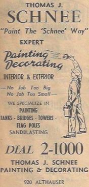 Revision as of 03:49, 17 December 2011 by Randylyon (talk | contribs) (New page: left|thumb|250px|1955 advertisement. Photo courtesy: Bob RedingTHOMAS J. SCHNEE PAINTING & DECORATING. The 1955 ''Dubuque City Directory'' listed 920 Althauser. [[Cat...)